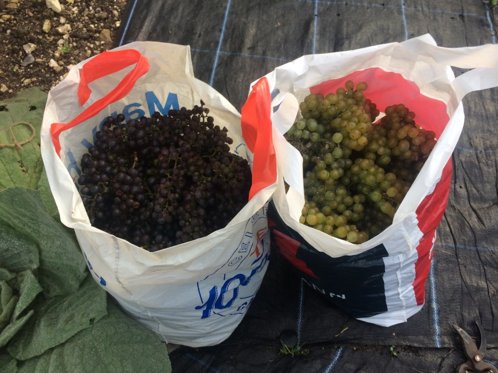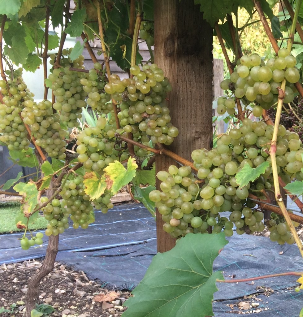4) Leave grapes to mature on the vine for as long as you can – Depending on the weather, you should aim to harvest your grapes in late September/early October. Up till that point, pick off any obviously rotting or wasp nibbled grapes to stop disease spreading to the bunch. The longer you leave them to mature on the vine, the more natural sweetness you’ll get.