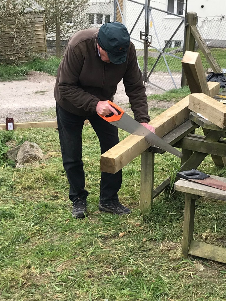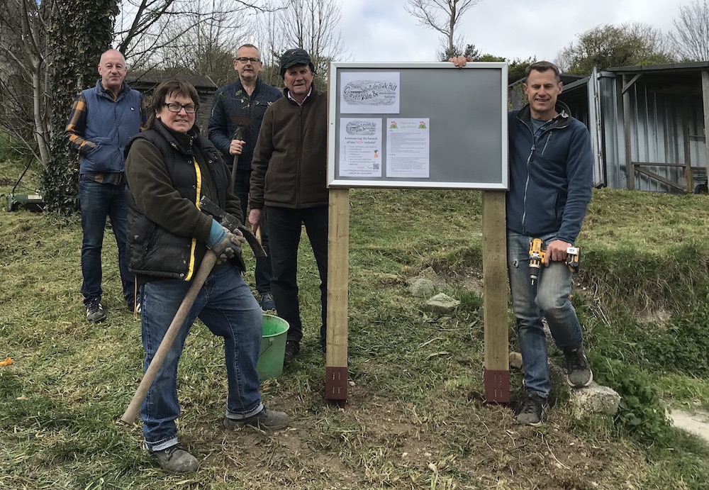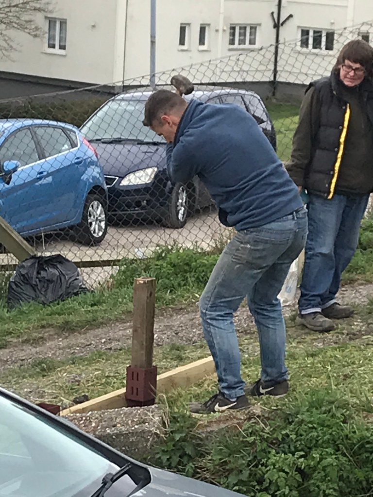 On Saturday of the Easter Bank Holiday, a group of six volunteers from the allotments society came together to form a work party (now that Covid rules allow it) to tidy up around the Hub, put up new noticeboards and erect a boundary fence.