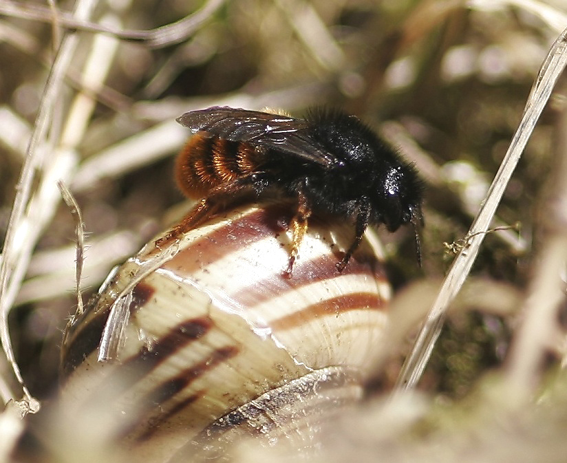 The Red Tailed Mason Bee flying around my plot is carefully examining empty snail shells. She is looking for one just the right size to lay her eggs in. When she finds the perfect snail shell she will lay a series of eggs in cells provisioned with pollen and separated by partitions of chewed up leaf matter until the shell spiral is full and then she will seal off the entrance with particles of soil and chalk. Then she will camouflage the snail shell by placing small sections of dried grass stalks over it in a cone shape. I sometimes see a female flying past me carrying a piece of grass stem two or three times the length of her body, a somewhat surreal sight.