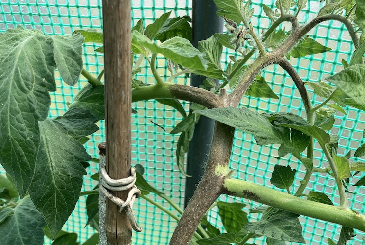 A supposedly resistant tomato variety showing bad signs of blight in its stem.