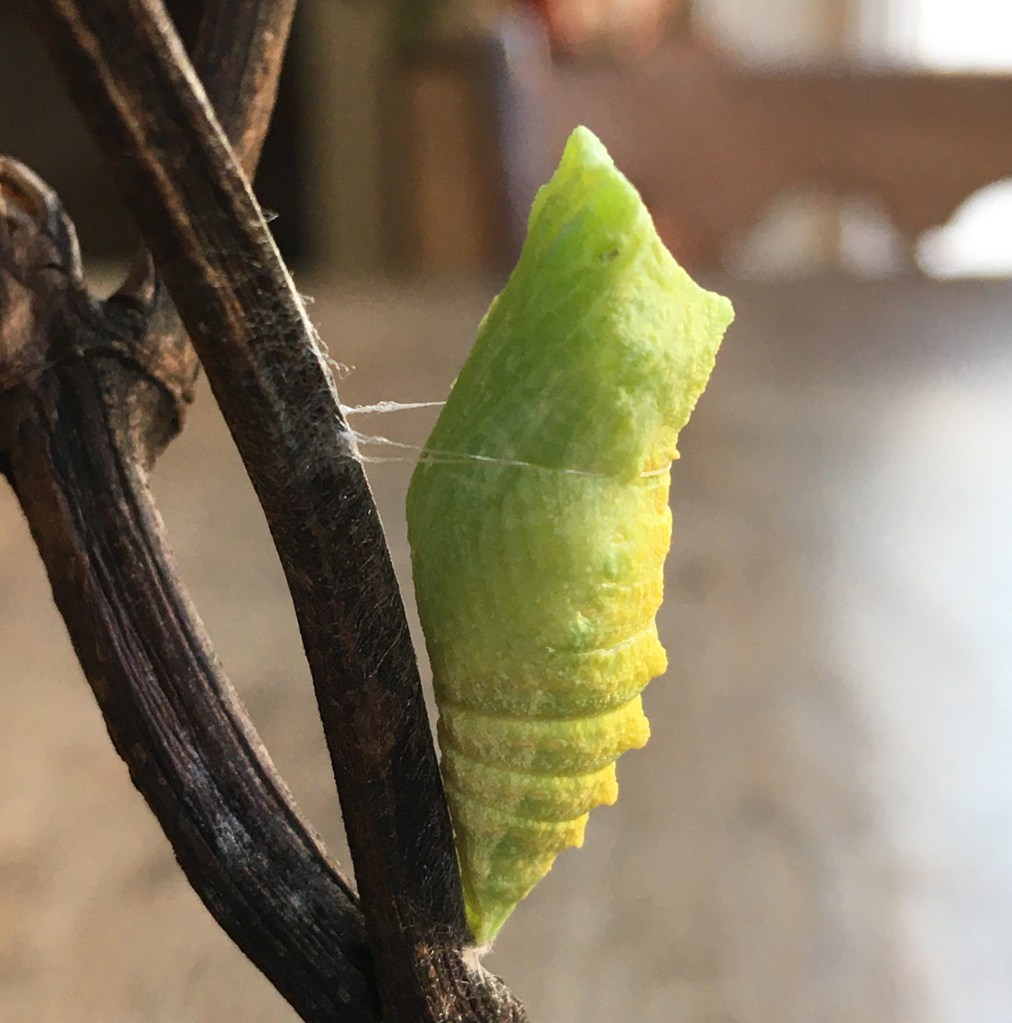 “I found two Swallowtail butterfly caterpillars on some fennel on our Craven Vale allotment last October. I didn’t think they would survive the winter so decided to look after them until the Spring. Initially I put them on pieces of fennel in a white bucket as they were still feeding. The next stage was to introduce a couple of twigs to the bucket for them to attach to for when they were ready to change into a chrysalis, which they eventually did”.