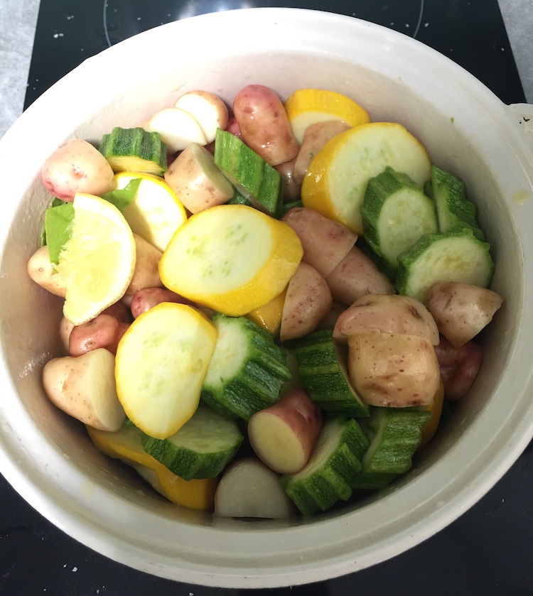 - Add the oil and warm it a little before adding the potatoes, courgettes, garlic, lemon, bay leaves and a good pinch of salt.