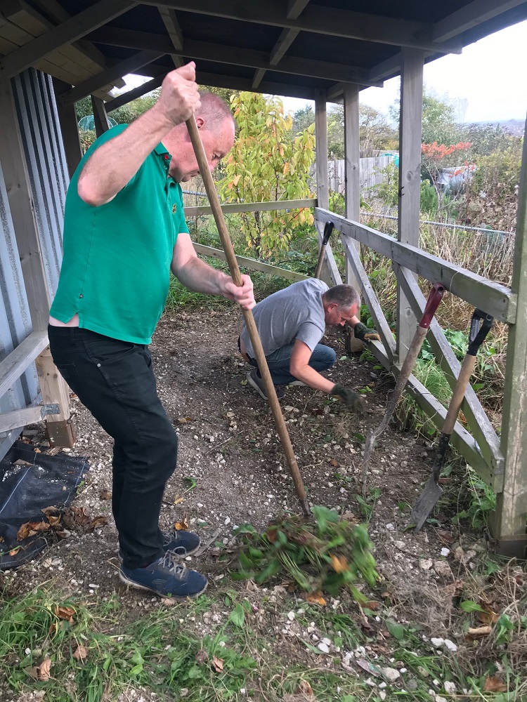 On 29 October a small team from the Craven Vale and Whitehawk Hill Allotments Society committee worked to improve the area under the shelter next to The Hub. The aim was to clear the area and lay gravel in order to make the space more accessible and usable. We were lucky with the weather and very pleased with the result.