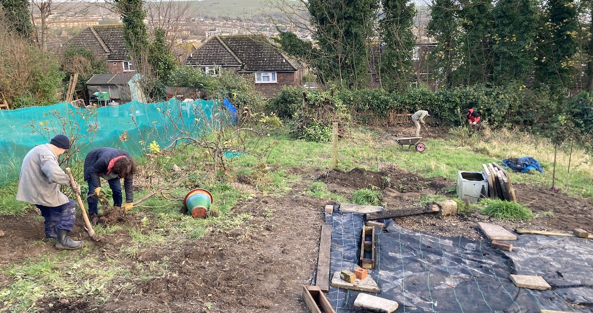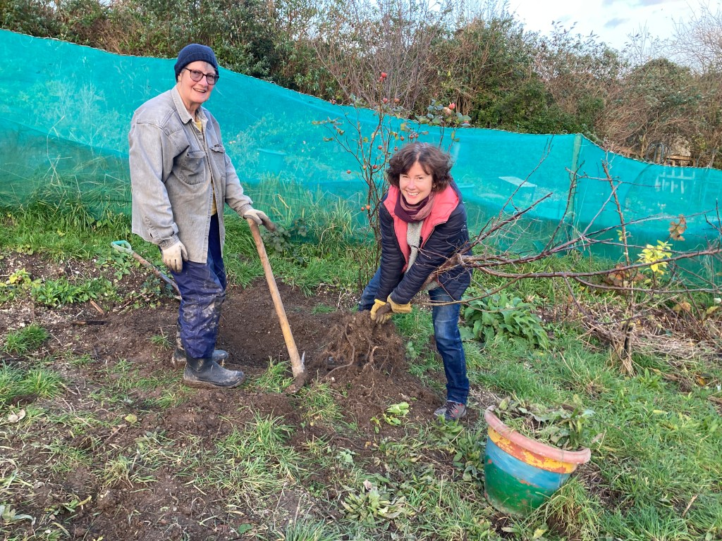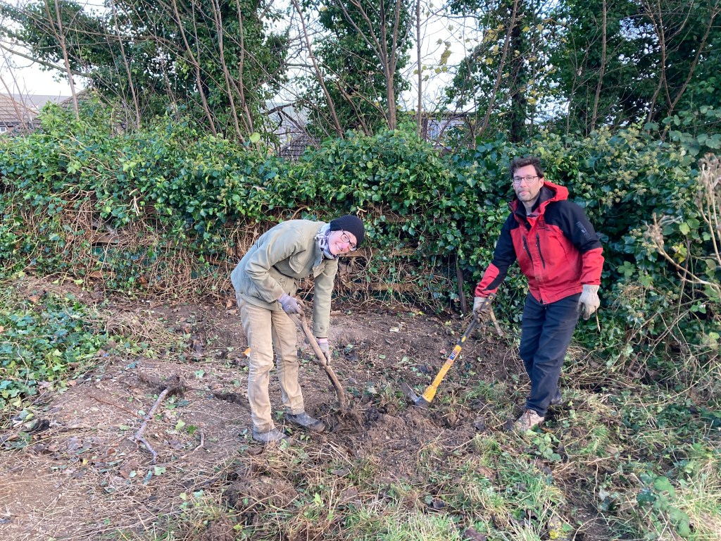 Thanks to all the volunteers who got stuck in on Saturday 9th December to help further clear the site in preparation for our Mini Bed Scheme, due to launch in spring 2024. Despite very dodgy and wet weather first thing, it remained dry for the rest of the day and we got lots done, including relocating a number of fruit trees to the bottom of the site to create a communal orchard, cutting back ivy and building a huge bonfire heap of rotten wood and dug up brambles.